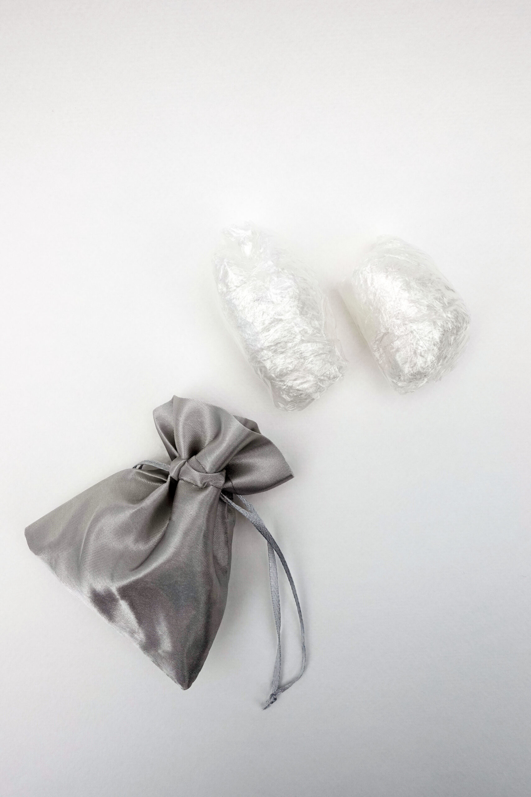 Zestaw 2 czepków firmy SILBET, spakowany w elegancki satynowy woreczek. Czepki wykonane są z folii LDPE, w rozmiarze uniwersalnym, służą do wykonywania rytuałów pielęgnacyjnych.
